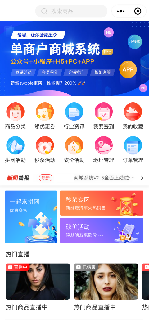 以社交电商为核心,搭配分销模式的分销体系,结合拼团、砍价、会员体系等热门社交电商玩法,助力企业突破传统获客瓶颈,实现线上销售业务的长效稳步发展
